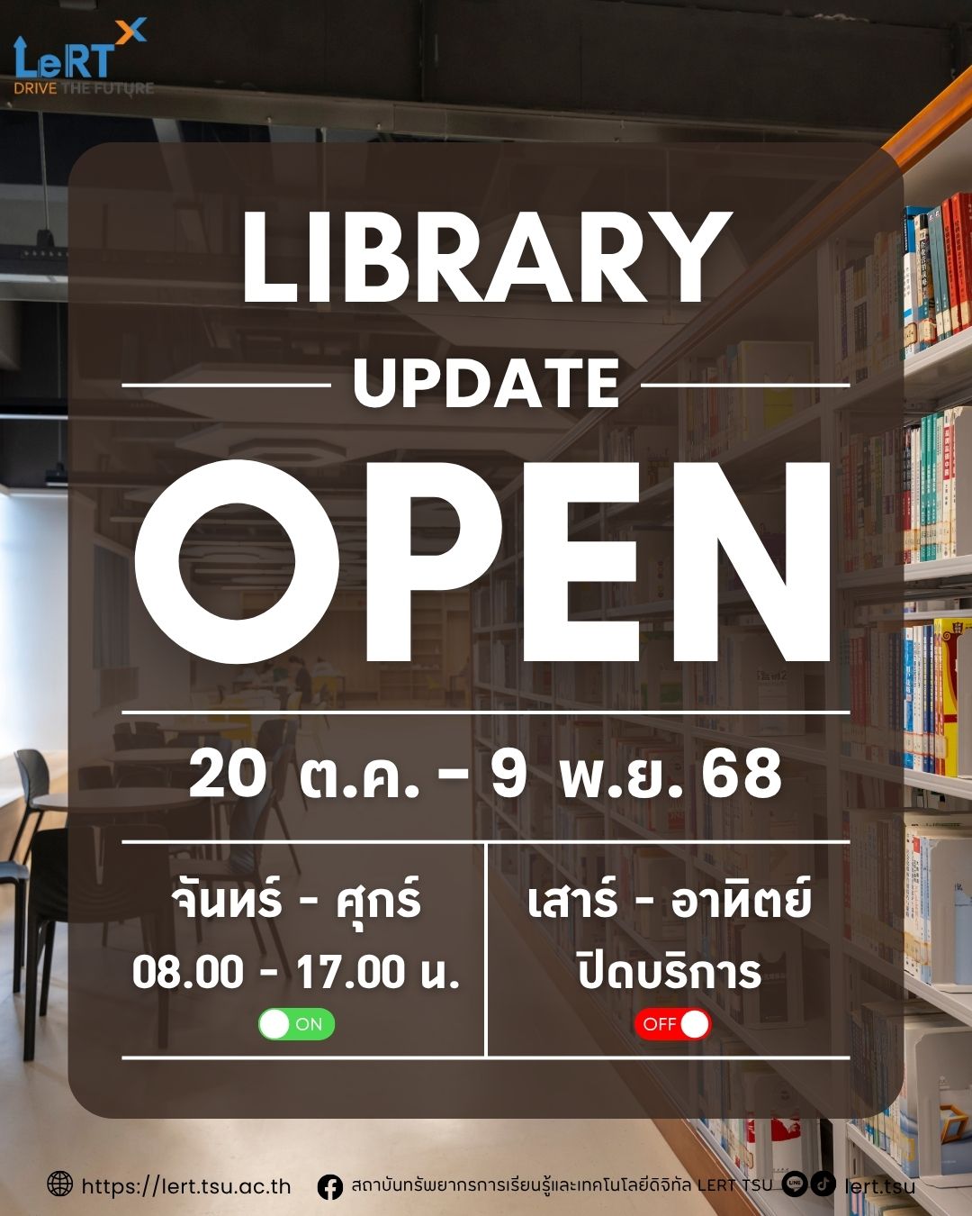 Update !! เวลาเปิดให้บริการห้องสมุด (ระหว่างวันที่ 20 ตุลาคม - 9 พฤศจิกายน 2568)