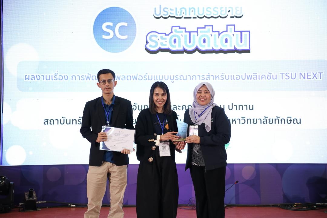 ผลงานที่ได้รับรางวัล คือ “การพัฒนาแพลตฟอร์มแบบบูรณาการสำหรับแอปพลิเคชัน TSU NEXT” ซึ่งนำเสนอโดย ทิตยา จันทร์สุข และ คิสตอน ปาทาน โดยมุ่งพัฒนาแพลตฟอร์มดิจิทัลที่สามารถเชื่อมโยงการให้บริการและการเข้าถึงทรัพยากรการเรียนรู้ของมหาวิทยาลัยไว้ในระบบเดียว ช่วยเพิ่มความสะดวกในการใช้งาน และสนับสนุนการสื่อสารข้อมูลภายในมหาวิทยาลัยอย่างมีประสิทธิภาพ