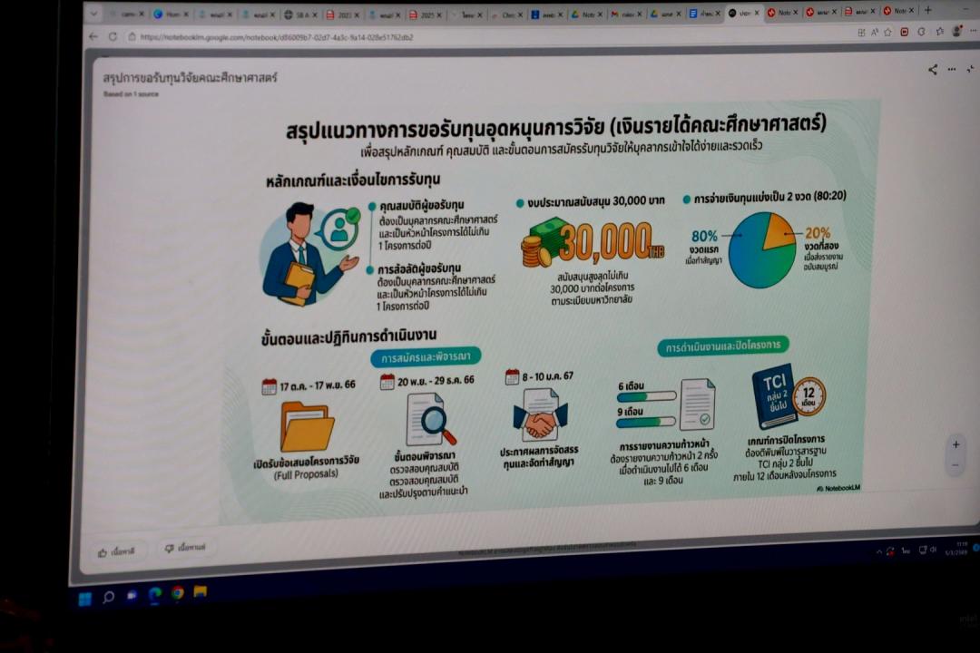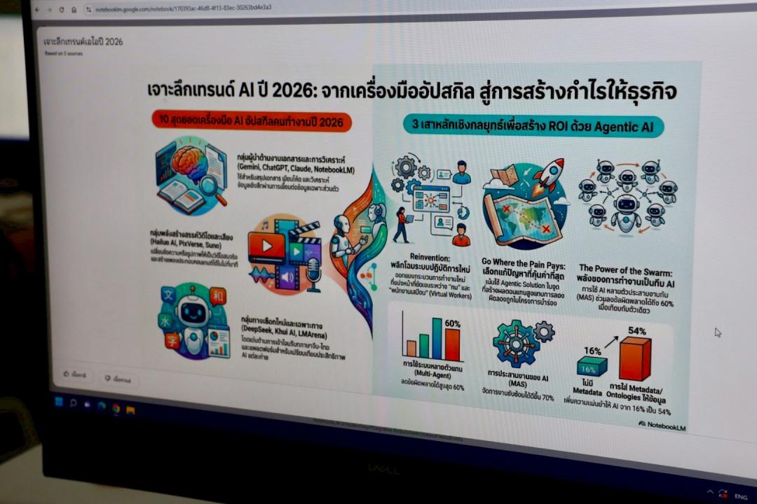 ภายในกิจกรรม ผู้เข้าร่วมได้เรียนรู้การใช้งาน NotebookLM แพลตฟอร์มปัญญาประดิษฐ์ที่พัฒนาโดย Google ซึ่งสามารถวิเคราะห์ สรุป และเชื่อมโยงข้อมูลจากเอกสารต้นทางของผู้ใช้ รองรับไฟล์หลากหลายรูปแบบ พร้อมช่วยเรียบเรียงประเด็นสำคัญ จัดทำร่างเอกสาร และตอบคำถามจากแหล่งข้อมูลที่กำหนด ทำให้การจัดการข้อมูลจำนวนมากเป็นเรื่องที่สะดวกและเป็นระบบมากยิ่งขึ้น